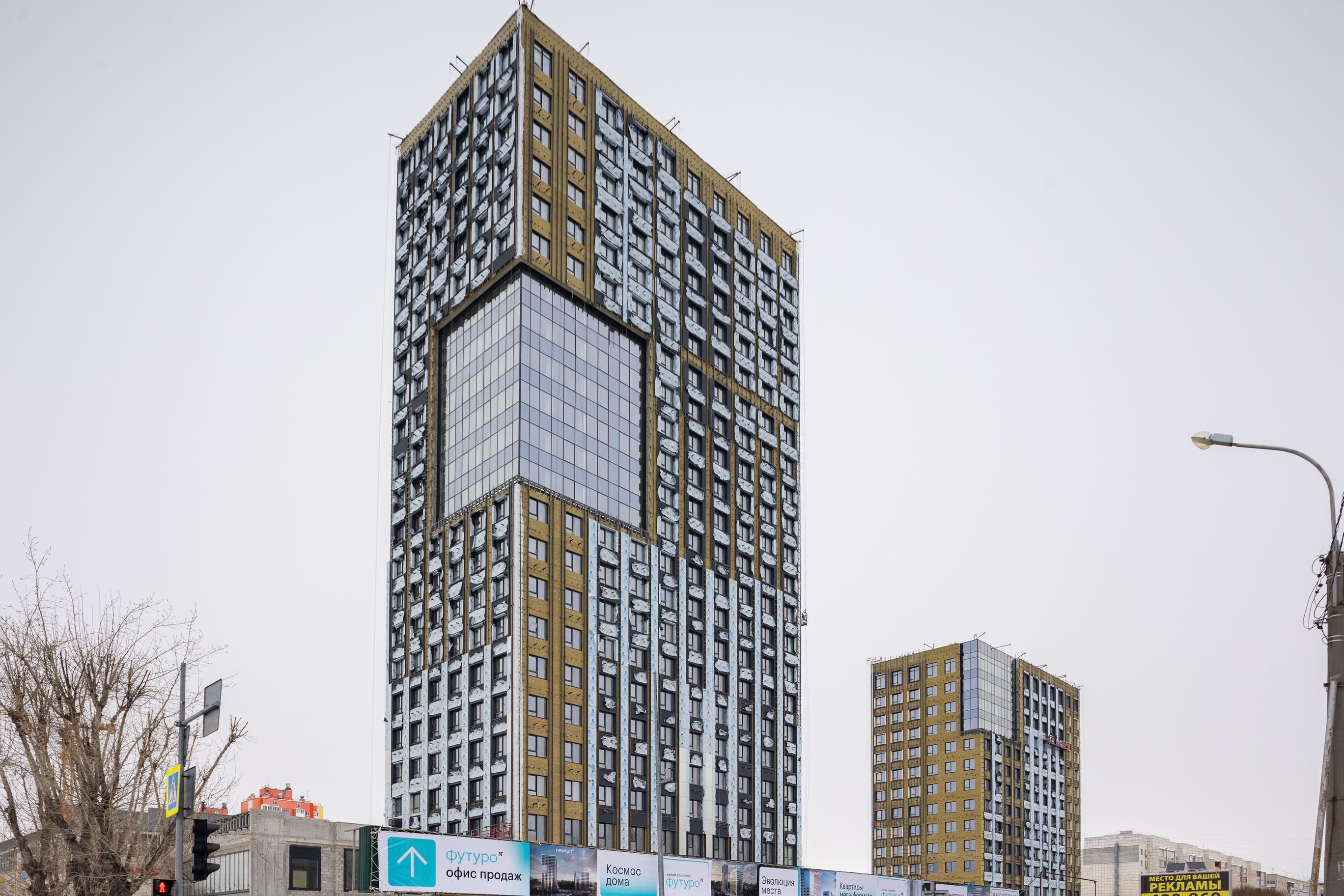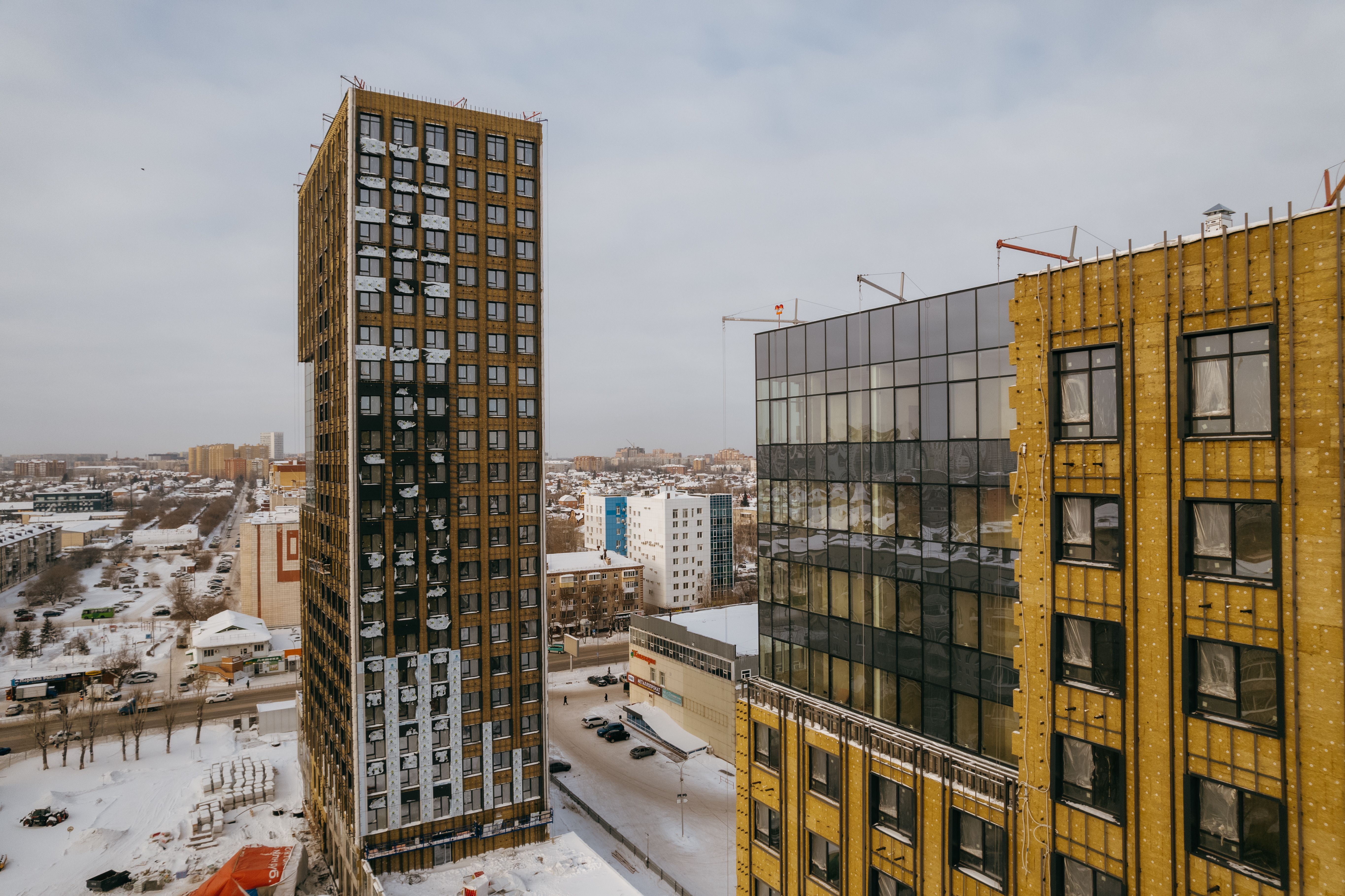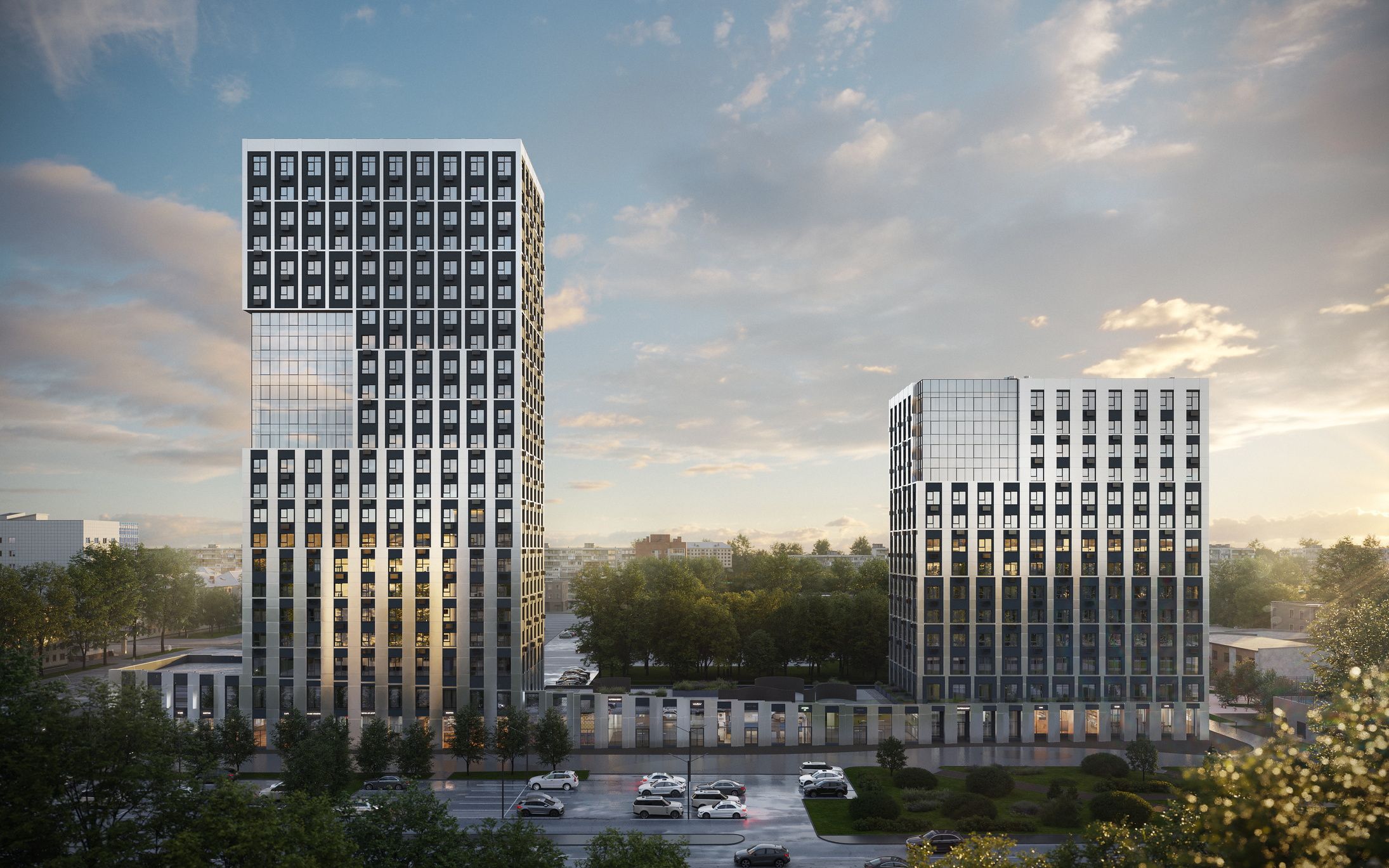 - — архитектура, формирующая новый силуэт района: две башни 23 и 14 этажей, стальные фасады, большие окна и выразительная геометрия;