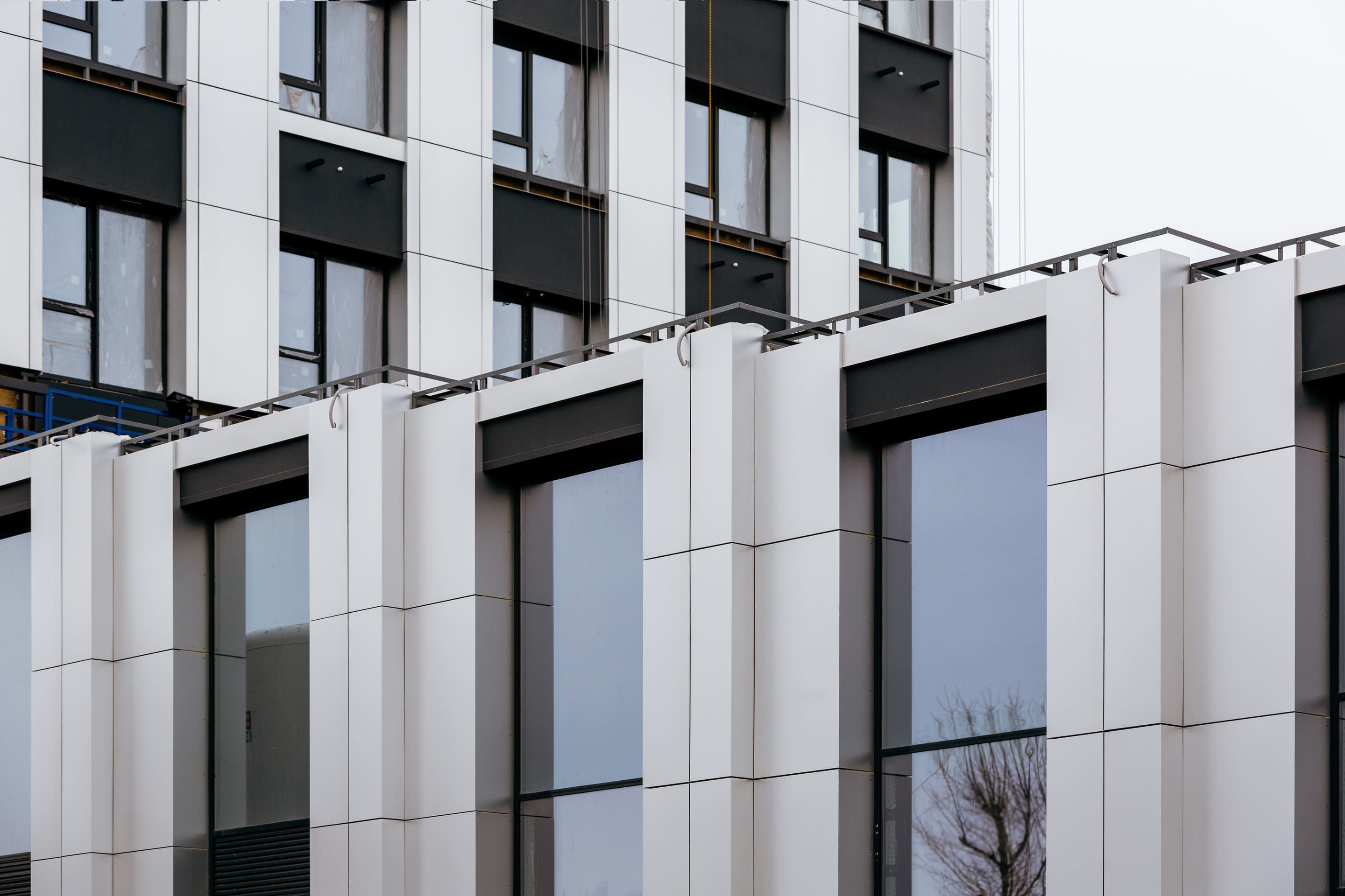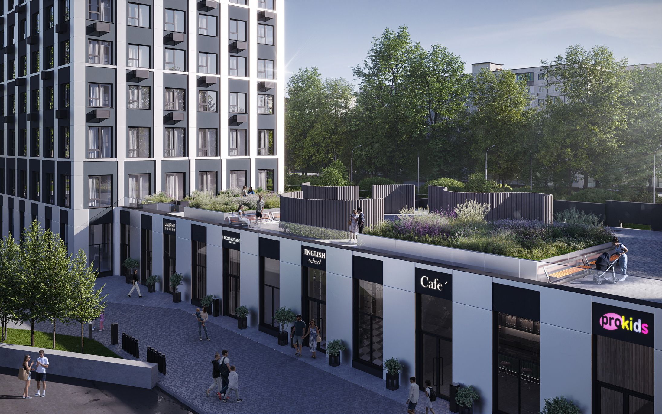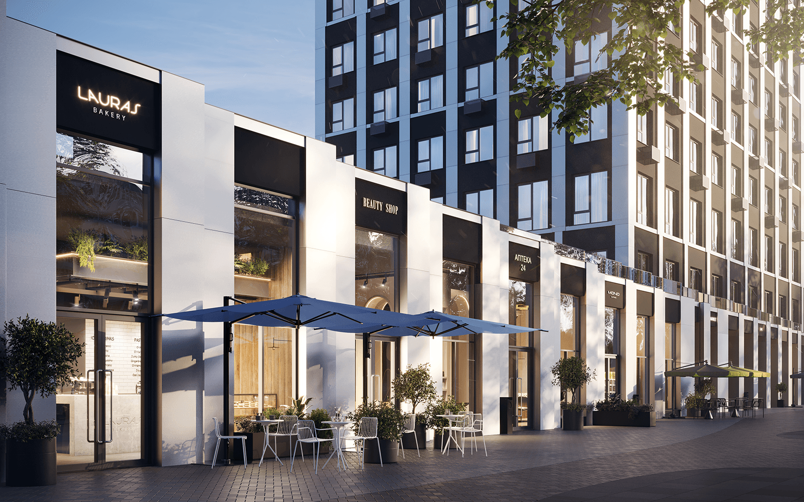 - — архитектура, формирующая новый силуэт района: две башни 23 и 14 этажей, стальные фасады, большие окна и выразительная геометрия;