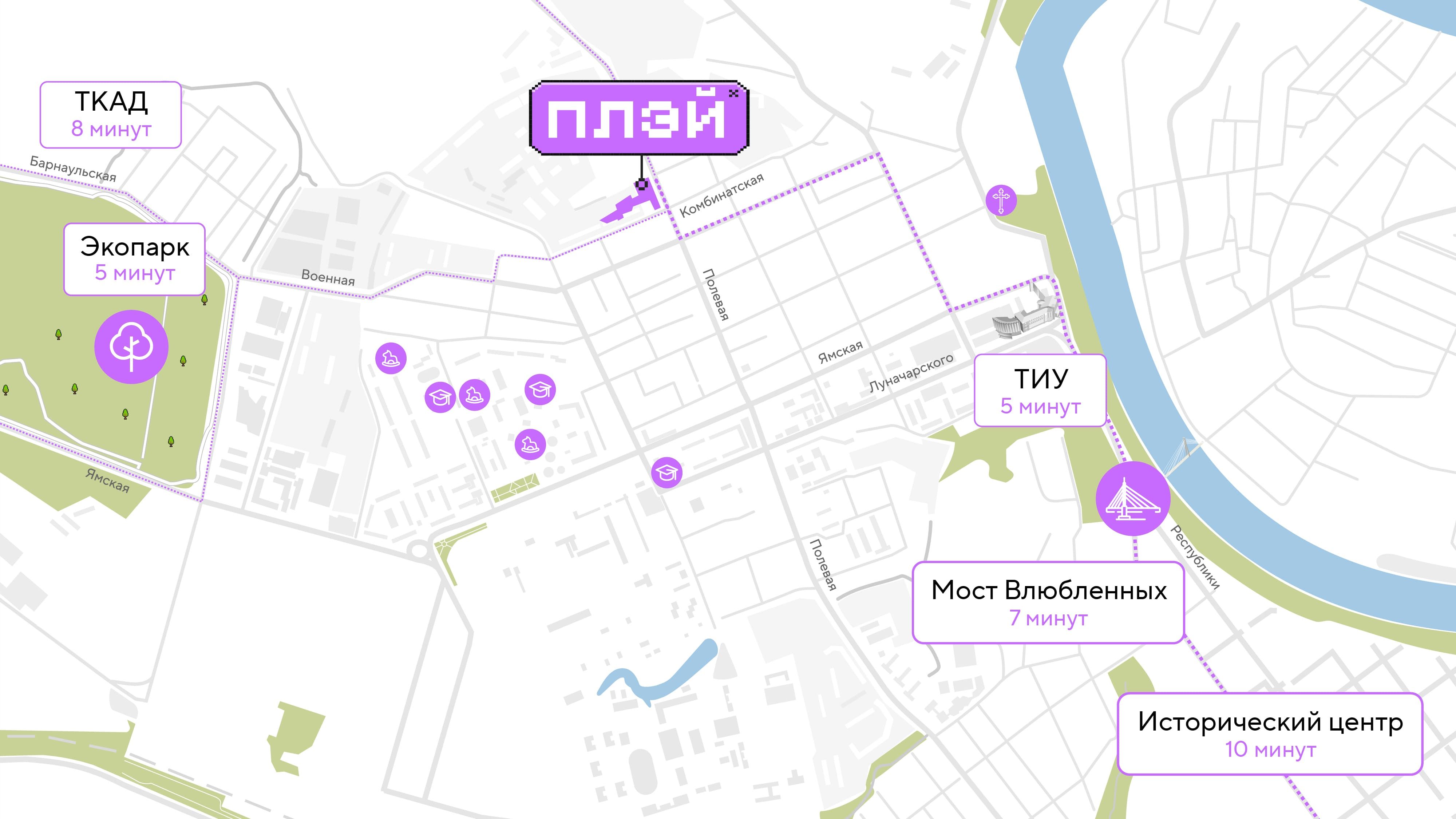 Удачное расположение — один из главных преимуществ Плэй. Всего 10 минут до центра Тюмени, 5 минут до Тюменского индустриального университета, 6 минут до Моста Влюбленных и ключевых городских точек.