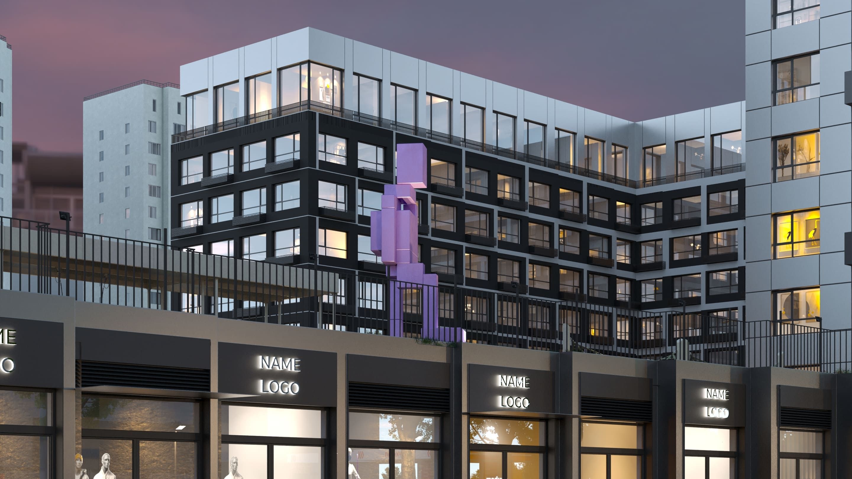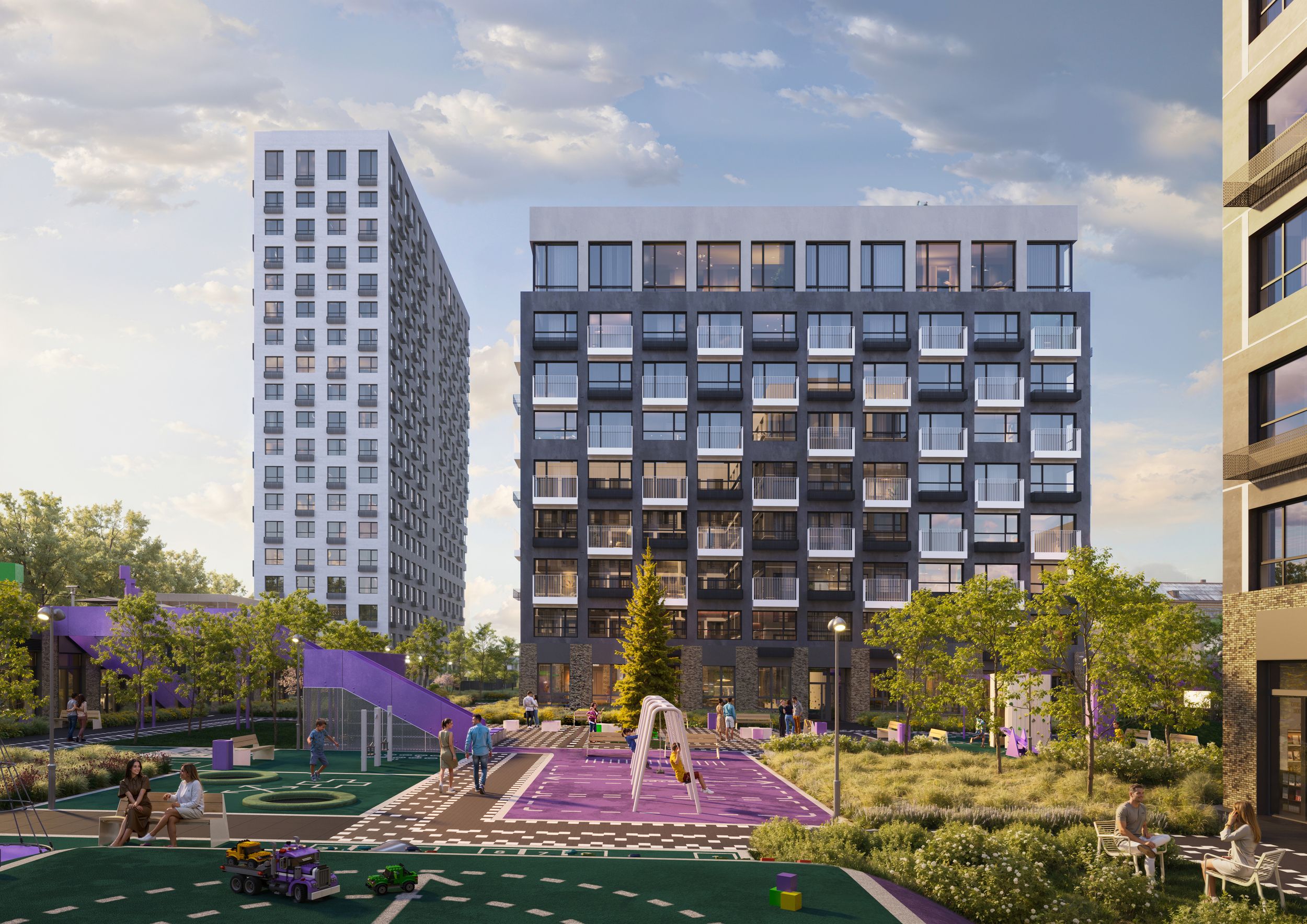 Концепция Плэй вдохновлена идеей игры: начало нового уровня, квест, движение к победе. Эта философия отражена в архитектуре, благоустройстве и фирменном стиле проекта. Парусные видовые секции, пиксельные элементы, динамичные фасады — все это создает современный и узнаваемый облик комплекса.